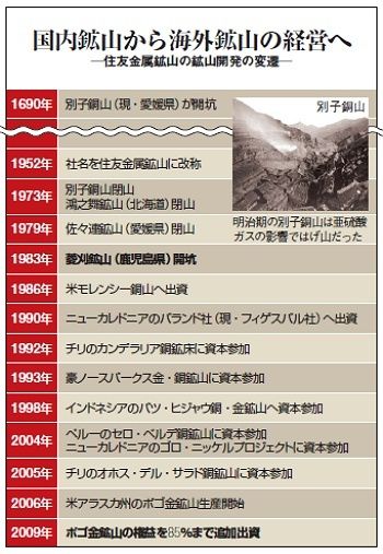 住友鉱山は2004年にペルーの銅鉱山、ニューカレドニアのニッケル事業へ資本参加、05年にチリの銅鉱山へ資本参加するなど、資源ビジネスを本格化。現在も年間40億円を探鉱費用に充てており、「資源開発案件への参入は年間15~20件を目指して交渉している」(家守社長)。従来は国内への鉱石の海上輸送を視野に入れ、太平洋沿岸の開発が中心だったが、今ではそれ以外のエリアも対象に鉱山開発案件を物色中だ。