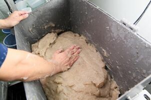 石橋屋ではおいしさを追求した結果、このバタ練りを守り続け、また長年のノウハウで独自の製造工程を確立している。今まで職人の経験による感覚のみに頼って来た手法を研究し、練りのスピードや温度などをデータ分析してマニュアル化し若い職人の育成に利用している。
