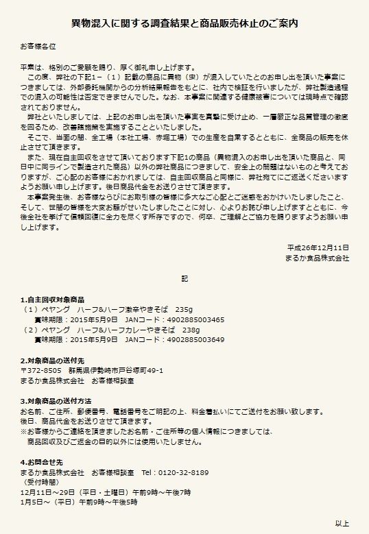 自主回収するのは、ゴキブリ混入があった商品と同日中に同ラインで製造された先述の2商品のみだが、それ以外の商品についても消費者が不安に感じるのであれば、まるか食品宛てに商品を返送すると、後日商品代金を送るという(詳細はまるか食品ホームページ参照)。