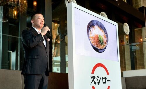 ラーメン第1弾を発表する、あきんどスシローの豊﨑社長(撮影:大澤誠)