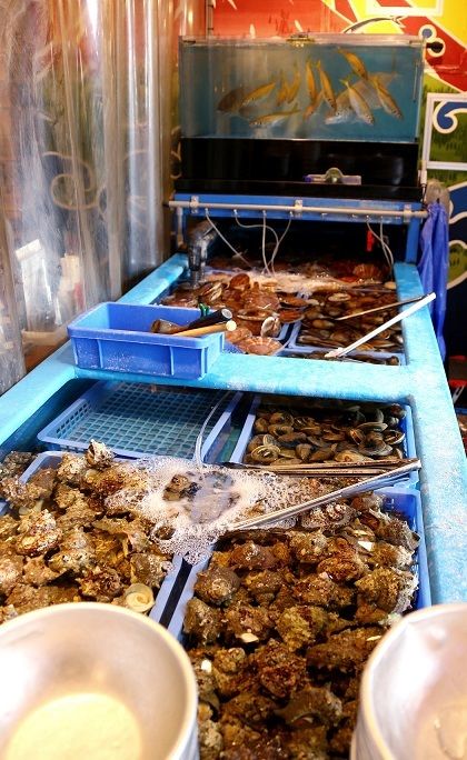 店内の生け簀には、魚介類が豊富に取りそろえられている