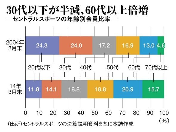 それはセントラルの年齢別会員比率を見ても明らかだ。今年3月末と10年前の04年3月末では、30代以下が全体の48%から26%へほぼ半減。逆に60代以上は18%から37%へと倍増した。寝たきり防止、介護予防など、切実なニーズのあるシニア層が、大量に増えたわけだ。