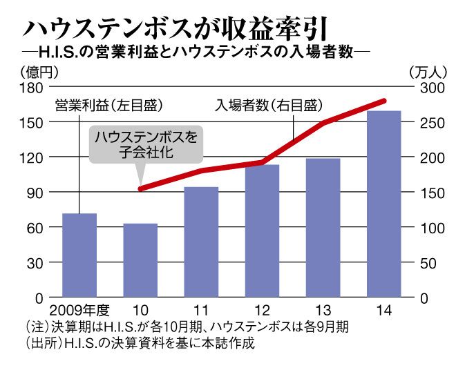 旅行代理店大手、エイチ・アイ・エス(H.I.S.)の快走が止まらない。12月5日に発表した2014年10月期の売上高は5232億円で前期比9.1%増、営業利益に至っては159億円と同34.3%の大幅増となった。