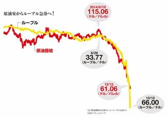 ロシアはサウジアラビアに次ぐ世界第2位の産油国。GDP(国内総生産)の75%を石油と天然ガスに依存する。ウクライナ問題に伴う米欧からの経済制裁も、ロシア経済を締め上げている。14年夏以降、原油価格が下降線を描くとともに、比例してルーブルも下落を続けてきた。