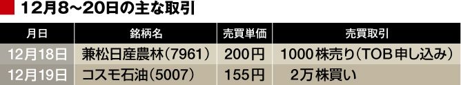 【12月8日(月)】先週末のNYダウは、58ドル高の1万7958ドルと小幅反発。9時6分、日経平均株価は、1万8000円台を回復したが、大引けでは15円高の1万7935円で驚異の7日続伸。7~9月期の実質GDP改定値は、年率1.9%減に下方修正。魚力(7596)から9月権利の優待品(年1回)が届く(今年はクール宅急便で明太子と数の子のセット)。配当は3月期末に年1回。