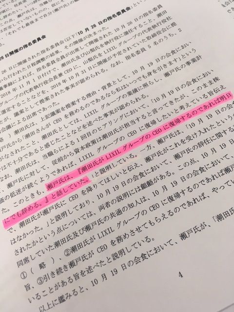 もう1つ、6ページに「瀬戸氏がきれいに辞める方法」と書いている。明確に(人事を決めた10月31日の)取締役会の前段階でその条件(瀬戸氏が2019年3月末までリクシル社長に留任すること、同年6月の定時株主総会までリクシル取締役に留任すること)まで合意ができていた。