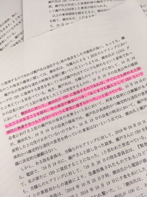 「リクシルは2月25日に要旨を公表した、潮田氏が瀬戸氏が辞任する意向があるように説明したこと、瀬戸氏に対して指名委員会の総意なので辞任を促した事実を認定している」