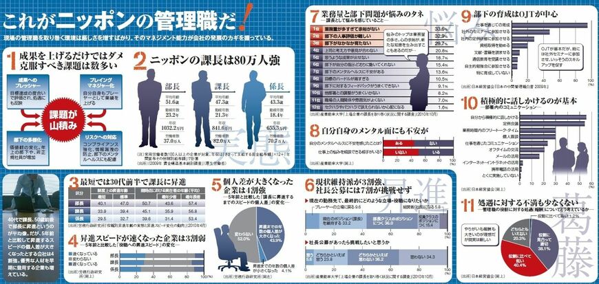 管理職が一般社員と違うのは「部下がいること」。ゆえに、管理職の悩みは募る。「課長として悩みを感じていること」を問う調査では、1位は「業務量が多すぎて余裕がない」。そして2位の「部下の人事評価が難しい」、3位の「部下がなかなか育たない」など、部下についての悩みが続く。