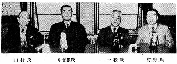 座談会を行った4人。左から評論家の田村幸策氏、国民民主党衆議院議員の中曽根康弘氏、自由党参議院議員の一松政二氏、日本社会党の河野密氏