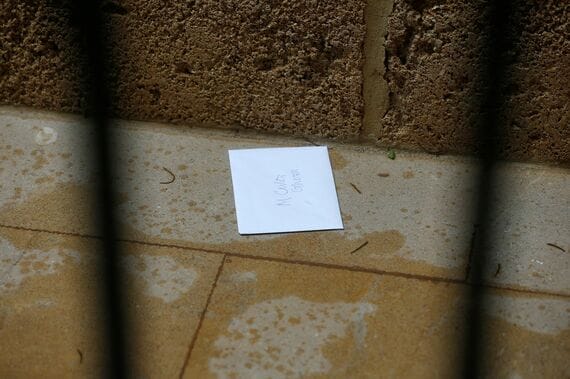 2019年12月31日、ベイルートのゴーン氏の別荘とみられるアパートの玄関に置かれた封筒。隣人が置いて行った(写真:REUTERS/Mohamed Azakir)