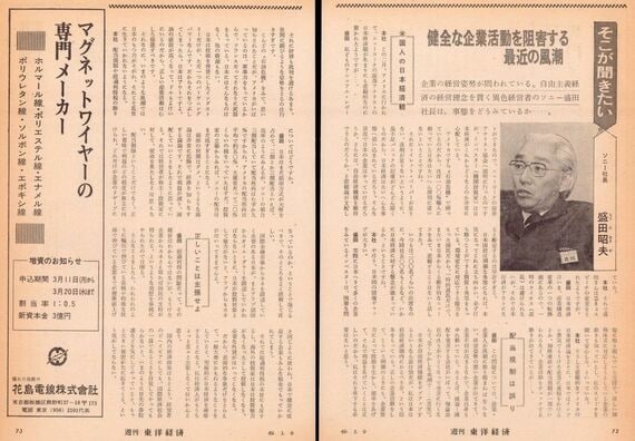 今回の「覧古知新」は1974年3月9日号に掲載されたソニー共同創業者、盛田昭夫氏へのインタビューをお届けする。