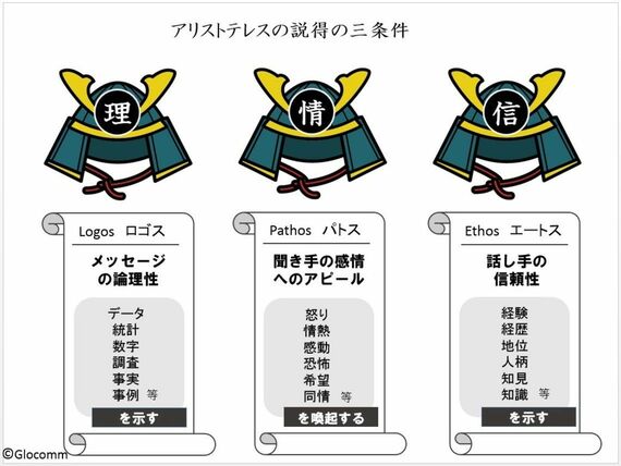 レトリックにも神経を使う必要がある。古代ギリシャ時代に発達した、人を動かす説得術「レトリック」。哲学者アリストテレスは、優れた話し手は「ロゴス」(論理)、「パトス」(感情)、「エートス」(信頼性)の3つのアプローチを習得しなければならない、と説いた。