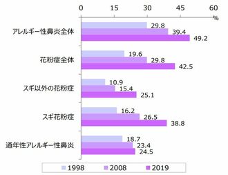全国の耳鼻咽喉科医本人とその家族を対象に、1998年から約10年おきに実施されている「鼻アレルギーの全国疫学調査」によると、2019年に花粉症の有病者は、スギ花粉症が38.8%、スギ以外の花粉症が25.1%で、花粉症全体では42.5%だった。