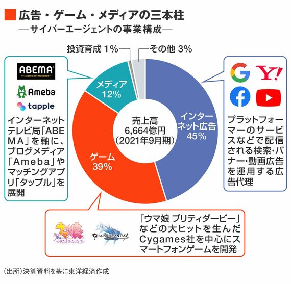 スマートフォンゲーム「ウマ娘 プリティダービー」が2021年に大ヒットし、インターネットテレビ局「ABEMA」では2022年11月に開幕するサッカー・ワールドカップ(W杯)カタール大会の全64試合を無料生中継することが発表されるなど、サイバーエージェントはエンターテインメント系の話題が多い。