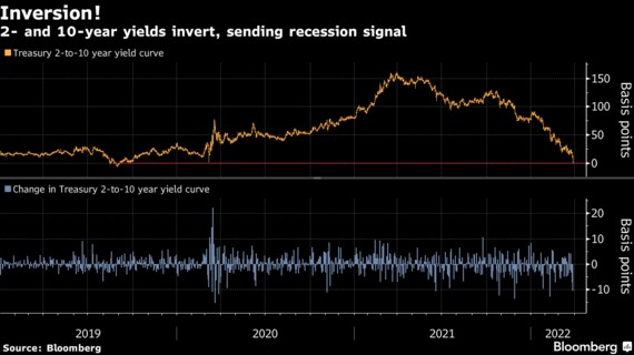 米国債の2年物利回りが10年物を一時上回り、この組み合わせでは2019年以来初めて逆イールドが発生した。償還期限が短めの米国債利回りが長めのものより高くなる逆転現象は他の年限同士でも見られており、米金融当局の利上げが景気後退(リセッション)を引き起こしかねないとの見方を強めている。