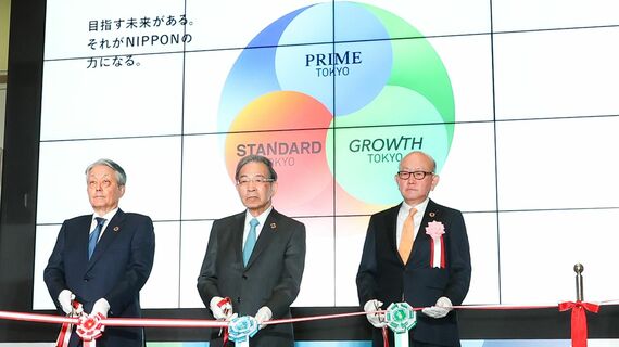 4月4日からの新市場始動に当たって東京証券取引所で行われたセレモニー。写真中央は日本取引所グループの清田瞭CEO(撮影:今井康一)
