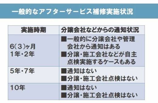 2年目以降、分譲会社・施工会社(管理会社)からアフターサービスの時期を知らせる通知はほぼないと考えていい。さらにアフターサービスは10年目にもなると、大規模修繕工事の実施時期などの劣化診断を兼ねることが最も合理的であるといえる。