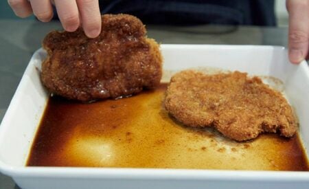 トンカツを両面、ソースに浸しておきましょう(写真:吉澤健太)