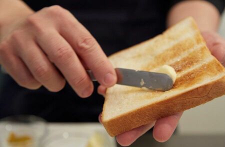 カツのボリュームに負けないよう、食パンは6枚切りがいいみたいです。バターは塗りやすいよう、常温にもどしてやわらかくしておきます。急ぐならレンチンで(写真:吉澤健太)