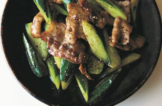 ② フライパンにごま油を中火で熱し、豚肉を炒める。肉の色が変わって、こんがりとしてきたらきゅうりを加え、きゅうりの角が少し丸くなるまで炒め、Aを加えてさっと炒める。器に盛りつけ、粗挽き黒こしょうをふる。