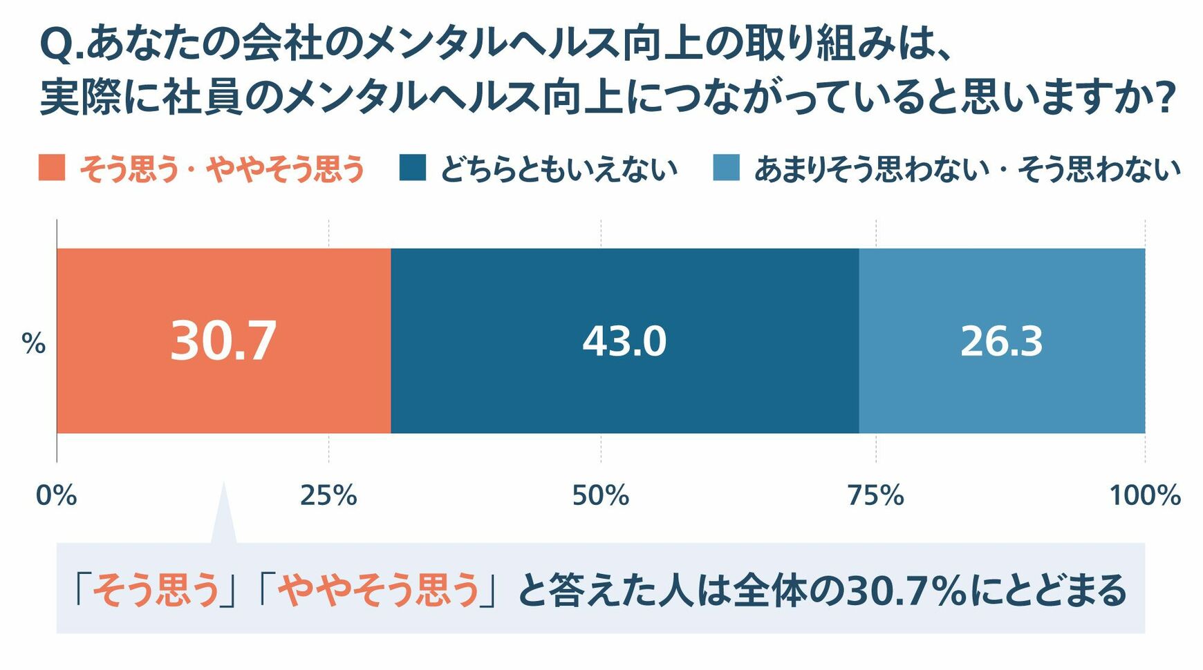 「会社は社員のメンタルヘルス向上に積極的に取り組んでいるか」と質問をしたところ、「そう思う」「ややそう思う」と回答した人の割合は、経営者が48.7%であるのに対して、営業担当者は24.5%だった。経営層が十分な対策をしているつもりでも、現場はそう評価していない。それどころか、会社が積極的に改善に向けて動いている姿勢が見えないことで、ストレスやモチベーション低下につながっているおそれもある。