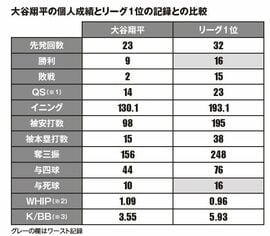 バッターは基本的に速球に的を絞っており、その状態で変化球がきたらうまく対応しようとする。ところがこれだけ球速差があると、的を絞ることがかなり難しくなる。次の表は大谷選手の成績とリーグ1位の成績を比べたものだが、1位と比較しても遜色のない数字が目立つあたりが、2021シーズンの活躍を物語っている。