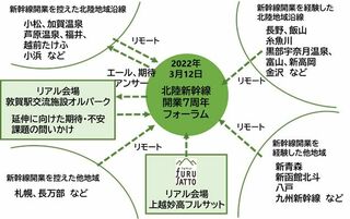 活動のスタートとして、連絡会議は3月14日の金沢開業7周年に合わせ、直前の土曜日の12日にフォーラムを企画した。フルサット内に加え、新幹線敦賀開業まちづくり推進会議と連携して、敦賀駅前の交流施設オルパークにパブリック・ビューイングの会場を設定。一方、Zoomにオンライン会場を設定してハイブリッド型のフォーラムを構成した。