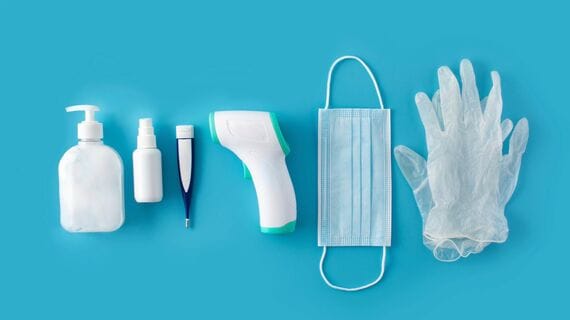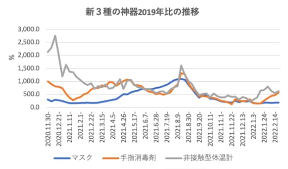 まずは、コロナ禍における「新3種の神器」(マスク、手指消毒剤、非接触型体温計)の動きから見てみたい。グラフは2019年との比較である。