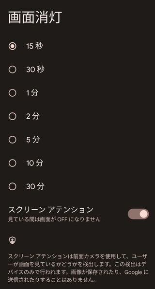 設定は、「設定」アプリの「ディスプレイ」にある「画面消灯」で行う。この中の「スクリーンアテンション」をオンにすると、設定が有効になる。ただし、撮影していない場合でも、自動的に前面のカメラがオンになるため、消費電力が増えてしまう点には注意が必要だ。処理は端末内で完結するため、顔写真が勝手に外部に送信されてしまう心配はない。