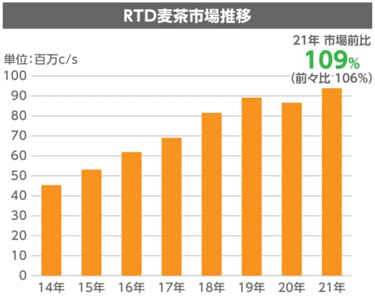 RTD市場での麦茶の売り上げは、2014年以降ほぼ右肩上がりに伸びており、21年までの7年で市場規模は2倍超になった(※1)。コロナ禍に突入した20年こそ前年割れしたが、翌年には持ち直し、再び成長基調に。ミネラルウォーターやスポーツドリンクなど他ジャンルからの流入も顕著で(※2)、RTD市場では珍しく、間口(ユーザー数)と奥行き(1人当たりの購入量)の両方が伸長している。