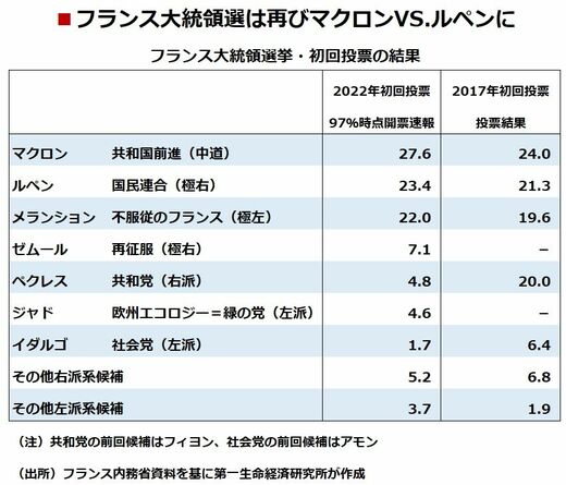 だが、ウクライナ情勢緊迫化によるマクロン大統領への追い風は長続きせず、初回投票日が近付くにつれ、ルペン、メランションの両候補が猛烈な追い上げをみせた。選挙戦の最終盤では、支持する候補者が決選投票に進出する望みがなくなった右派寄りの有権者の一部がルペン候補に、左派寄りの有権者の一部がメランション候補に流れたことも、両者の支持拡大につながった。