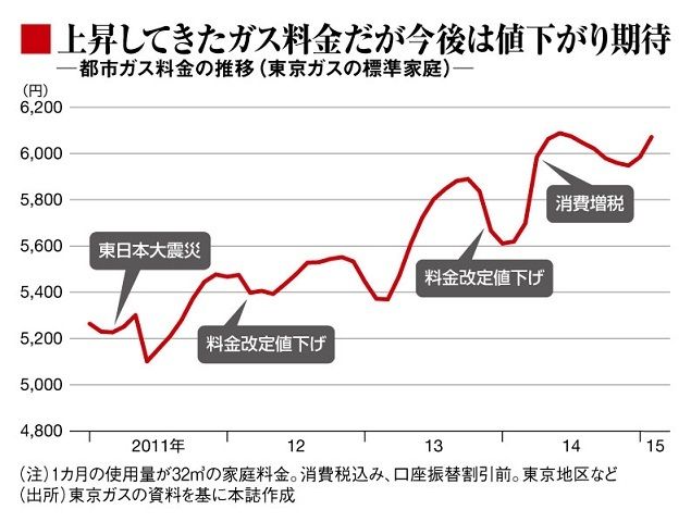 今後のガス料金の見通しは、やはりLNG価格と為替次第だ。ドル建てのLNG価格は、当面、弱含みで推移する公算が大きい。連動性の強い原油価格が急落しているうえ、世界最大のLNG消費国である日本で原発再稼働が近づき、原発を代替してきた火力発電用LNGの需要減退が見込まれるためだ。円相場が横ばいなら、ガス料金は低下する可能性が高い。