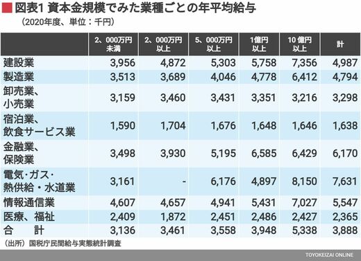 資本金10億円以上の平均給与534万円は、資本金2000万円未満の314万円の1.7倍だ。