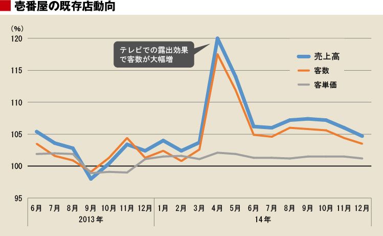 好調の要因は、テレビ朝日系列のバラエティ番組「アメトーーク!」の効果だ。昨年4月上旬に放送された「CoCo壱番屋芸人」という回で、人気芸人が壱番屋の商品を数多く紹介。放送があった2014年4月の既存店客数は、前年同月比で2割近い大幅な伸びになった。新年度に入ってからも勢いは持続し、2014年6~11月累計の既存店客数は同5.2%増という高い水準を維持した。