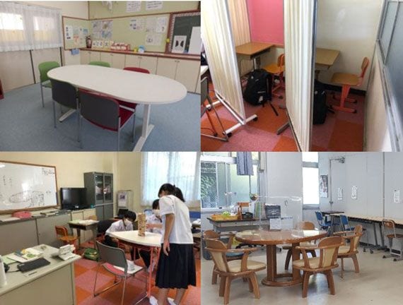 外の階段を上がってすぐ入れる部屋や玄関を通らなくて済む部屋など、周囲の視線を気にすることなく入室できる場所をSSRにする配慮も行う。また、学ぶ場所も自己決定ができるよう、パーティションやラウンドテーブルなどを活用して個別学習と協働学習が両立できるレイアウトを工夫している。