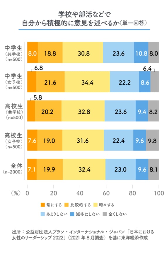 プラン・インターナショナル・ジャパンが行った調査の「リーダーになりたいか」という問いに対し、「はい」と答えた女子中高生は全体の16.6%にすぎず、「いいえ」(44.2%)と「分からない」(39.3%)と消極的な回答が8割を超える。自分について場を仕切るタイプではないと考えている女子の割合も多く、同団体の母体であるプラン・インターナショナルが世界19カ国で同世代の女の子を対象に行った調査でも、日本はリーダーを望まない人の割合が高かったという。