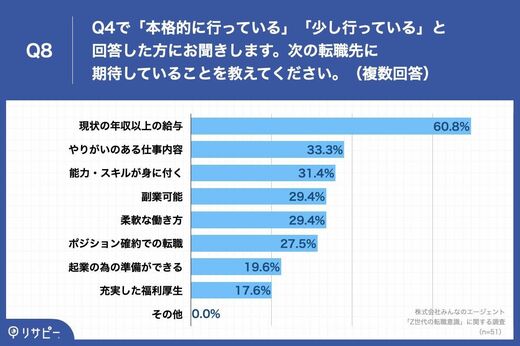 「やりがいのある仕事内容がしたい(33.3%)」「能力・スキルを身に付けたい(31.4%)」「副業が可能(29.4%)」「柔軟な働き方ができる(29.4%)」……と、希望の方向性は多様だった。そのほかにも、「起業のための準備ができること」「地域限定社員(転勤なし)であること」「リモートワークがしたい」「自分の夢に割く時間(仕事以外の時間)を取りたい」など、実に意見が多様化しているのがZ世代優秀層の特徴だと言える。