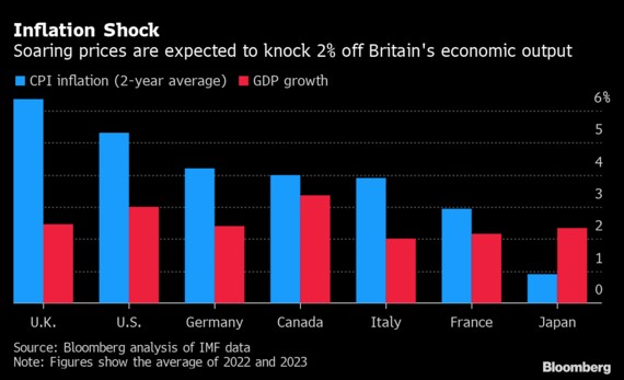 主要7カ国(G7)のうち今後2年間に物価上昇で最悪の衝撃に見舞われるのは英国だ。国際通貨基金(IMF)がこう警告し、同国の経済成長見通しを引き下げた。