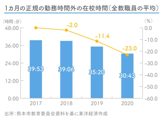 遠藤氏は教育長に就任した当初から「働き方改革はすべての改革」の前提として、1. 正規の勤務時間外の在校時間が1カ月80時間を超える教職員数ゼロ、2. 教職員の正規の勤務時間外の在校時間を25%削減(40時間から30時間に)を目標にしてきたのだ。