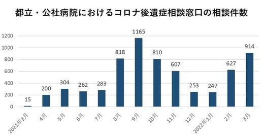 コロナ後遺症は感染者の10~30%が罹患するとされている。東京都が12日に公表した資料によると都立病院・公社病院におけるコロナ後遺症相談窓口の相談件数は、3月で914件と、前月の627件から大幅に増加した。第5波に襲われた昨年9月の1165件に次いで2番目の多さとなっている。