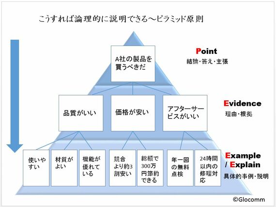 では、論理的な思考や読み書きに結びつく、説得力ある話し方の論理構成とはどのようなものか。「考える技術・書く技術」の著者で、元・マッキンゼーコンサルタント、バーバラ・ミントが説いた理論的な伝え方の法則が「ピラミッド原則」だ。まず、キーメッセージやポイント、つまり結論を伝え、それを裏付ける2~4点の理由・根拠を説明し、さらに、具体的な説明や事例を加えていく。これは、もう一つの代表的な論理構成とされるP-E-E (Point-Evidence-Explain)構造とも一致する。ポイント→論拠→説明の順番だ。