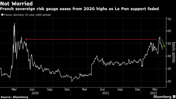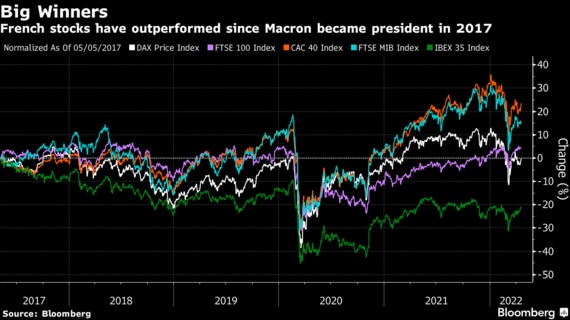 24日に行われたフランス大統領選挙の決選投票で現職のマクロン大統領の再選がほぼ確実となったことで投資家の間に安心感がもたらされそうだ。投資家は極右政党・国民連合(RN)のマリーヌ・ルペン氏の勝利なら欧州市場が混乱すると警戒していた。