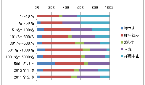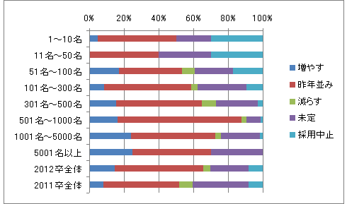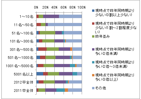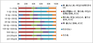 とくに「5001名以上」は「質・量ともよい学生が採用できそう」は0%という厳しい認識を示している。