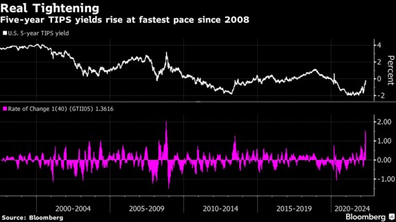 2年債や5年債の利回りが18年の水準を上回れば、08年の世界的金融危機以降見られなかったレベルに戻る。10年債利回りの18年のピーク(3.25%)は11年以降で最も高かった。一方、5年物TIPSの利回りは3日までの40営業日で150bp余り上げており、これは08年以降で最も速いペースだ。