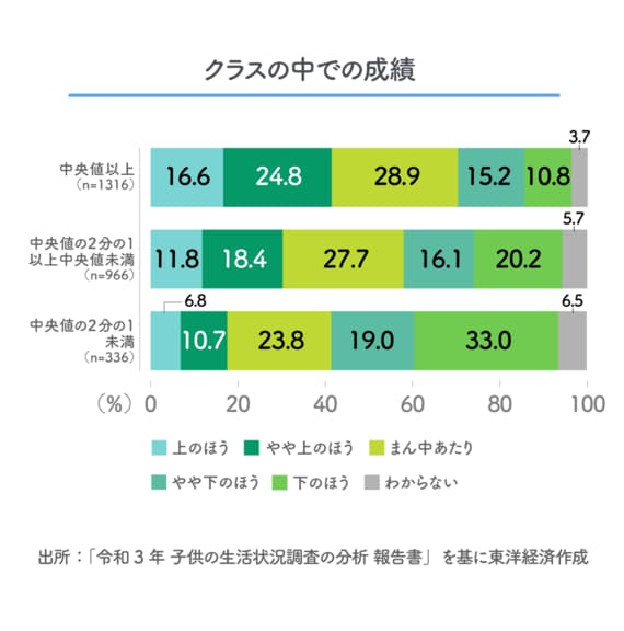 これらに留意したうえで、調査結果を見てみよう。まず、内閣府調査でも経済状態による学力格差を確認できる。「あなたの成績は、クラスの中でどのくらいだと思いますか」に対して、「下のほう」と回答した中学2年生は全体で17.3%、「非」貧困層(等価世帯収入が中央値以上)に限定すると10.8%だが貧困層だと33.0%である。この結果は中学2年生による成績の自己評価だが、世帯収入を含むSESと学力の関連を示す調査結果は多い。