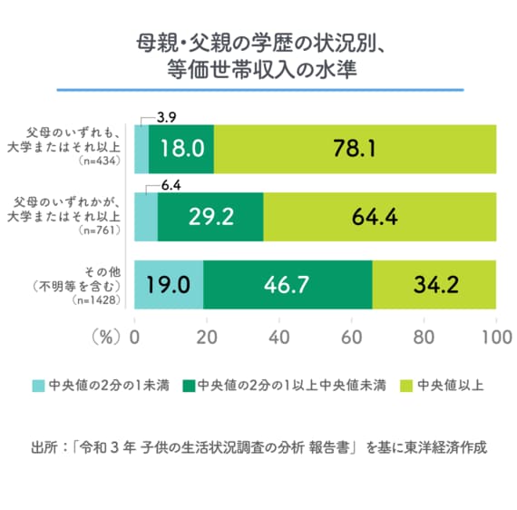 換言すれば、世帯収入が低い貧困層は、職業や学歴といった社会的・文化的な観点でも不利で、有形無形の資源を持たない傾向にある。総じて、「生まれ」によって結果に差のある「教育格差」社会の中で最も恵まれない条件にあるのが「子どもの貧困」層といえる。