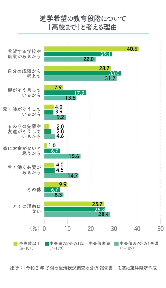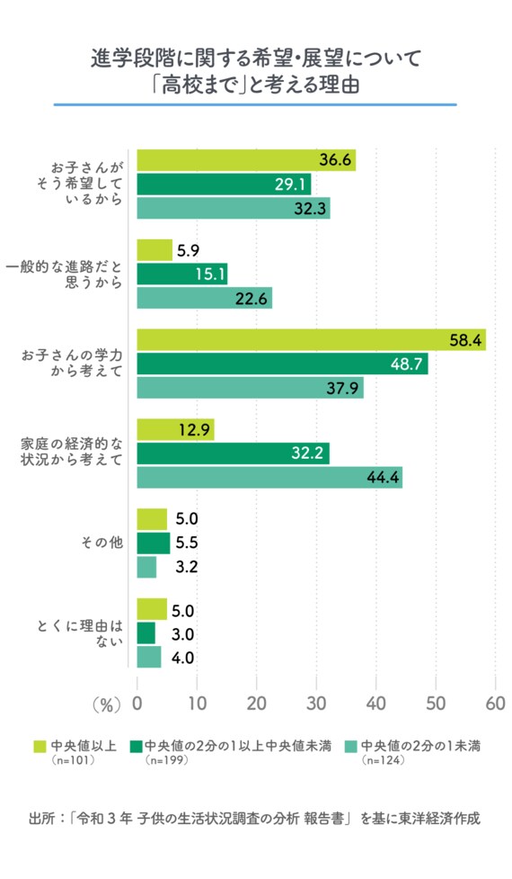 内閣府調査では、親が子の進学に対して「高校まで」と考える理由を聞いている。まず、「高校まで」を選んだ親は全体だと16.3%、非貧困層では7.8%だが貧困層では37.5%と高い。