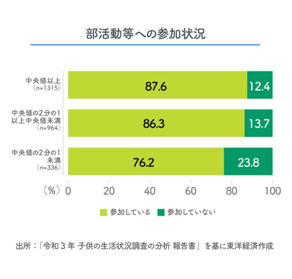 貧困による格差は学力・進学だけにとどまらない。例えば、中学2年生の部活動の参加率が貧困層において低い。部活動などに「参加していない」中学2年生は、全体では14.6%で非貧困層は12.4%だが、貧困層では23.8%である。