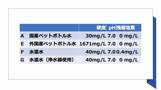 A、F、Gは軟水でEは硬水、pHはすべて7.0の中性だ。日本の水道水は硬度30〜80mg/Lの軟水が多いが、住んでいる地域によって異なる。