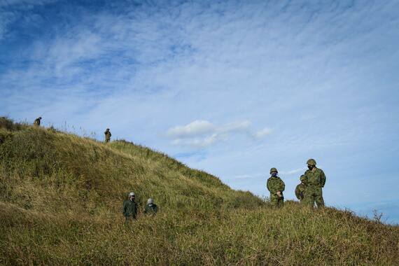 有刺鉄線や鉄製の柱などが設けられた浜辺に着くと、車両の後部扉から隊員らが飛び出し、陣形を整えた。ホーバークラフト2隻がその後に続く。実戦ではさらなる部隊や装備品を運ぶが、この日の訓練ではほとんど空っぽだった。仮想の占拠者からの海岸線奪還を巡る一連の動きを同僚の隊員らが高台から評価していた。